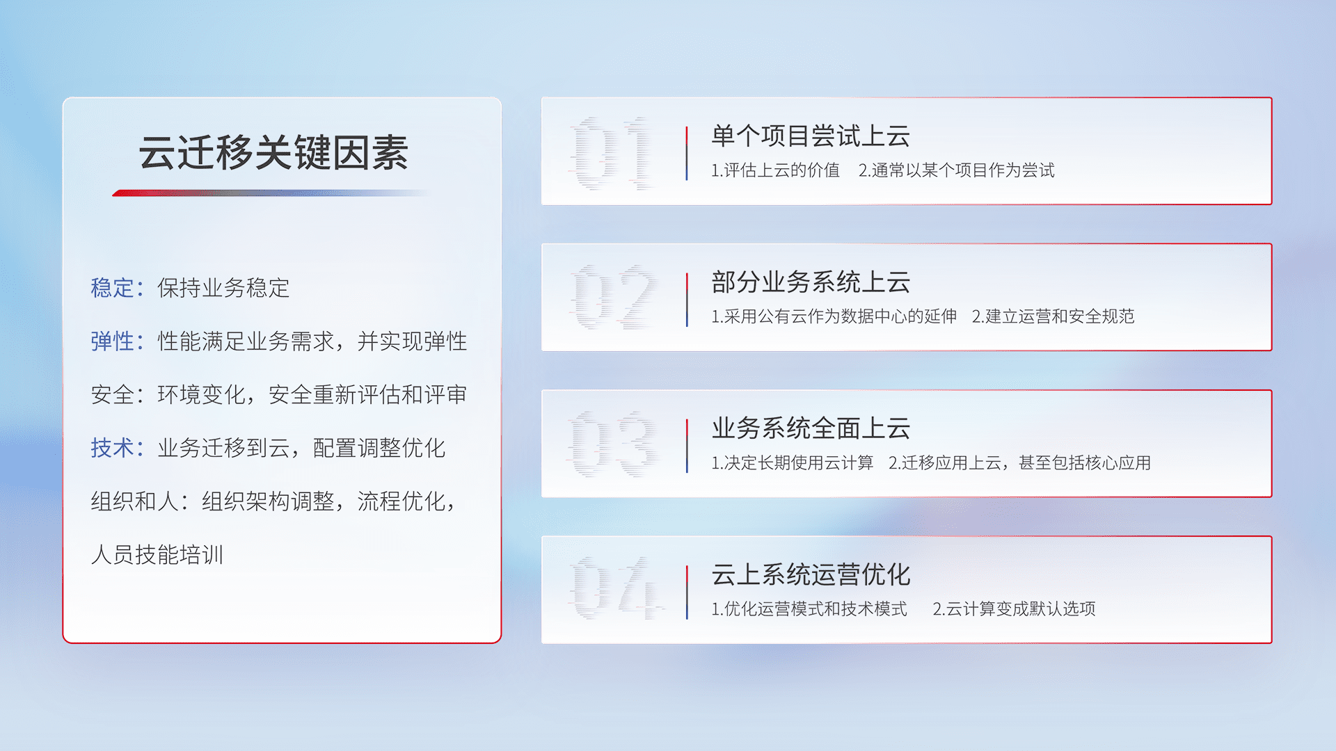 结合实际业务,,,,从规划设计、、、云平台选型、、、、云原生改造、、、数据迁移、、集成交付,,迁移全过程为客户识别最佳上云路径,,,做好风险识别管理,,设计网络架构、、、身份权限、、、安全审计合规、、、操作审计、、、、日志审计、、、、监控告警策略、、、多站点容灾设计等,,,,对云上基础设施进行整体规划,,,提升IT治理水平,,,,以满足弹性、、、、高可用、、、高性能的需求。。。。