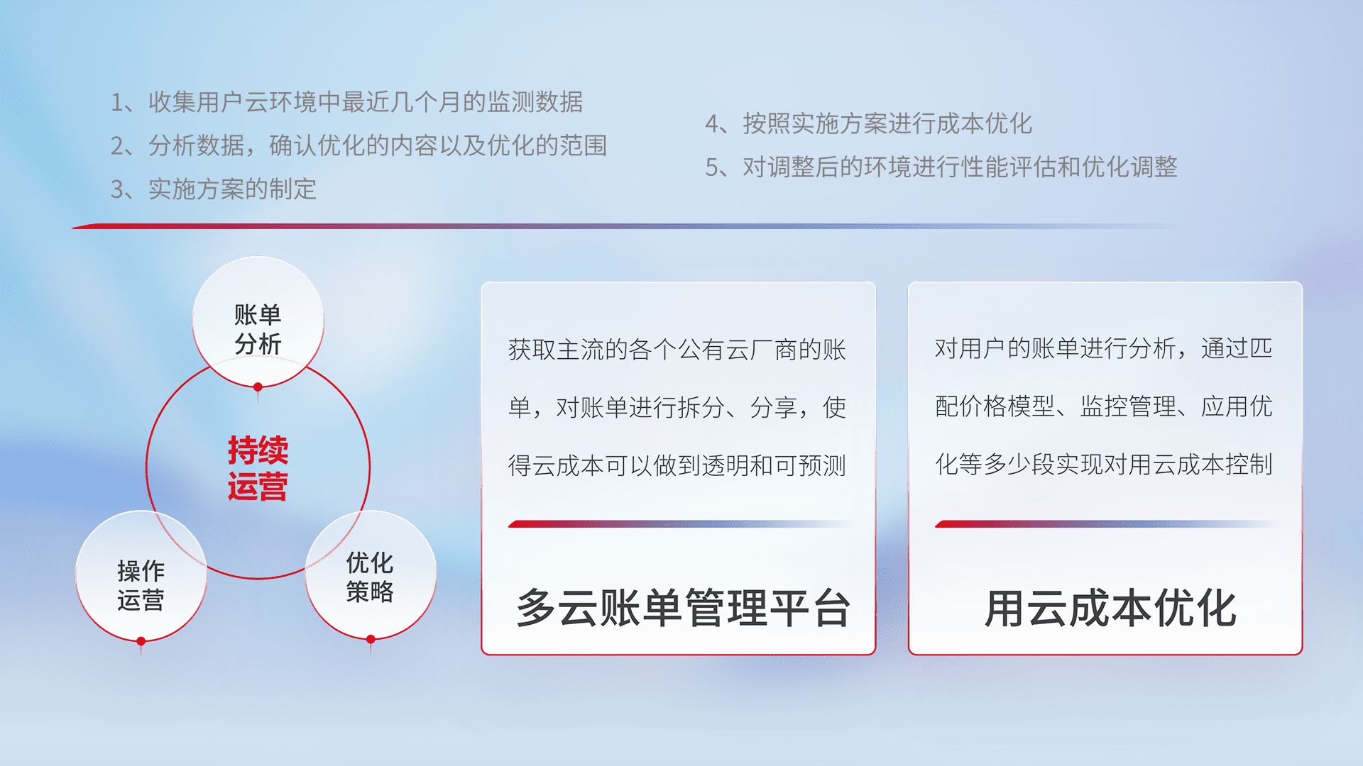 通过多云纳管,,,以统一的资源数据模型把客户的云资源进行抽象和封装,,进而实现对多云资源的统一操作,,,保障云资源管理的可靠性、、、稳定性与可用性。。。。量身定制化运维内容,,,,配置、、开发运维、、、补丁管理、、、备份、、、监控、、认证和访问管理、、、审计和日常巡检等,,保障在用云过程中的可靠度,,,,稳定度以及高可用率。。。。
